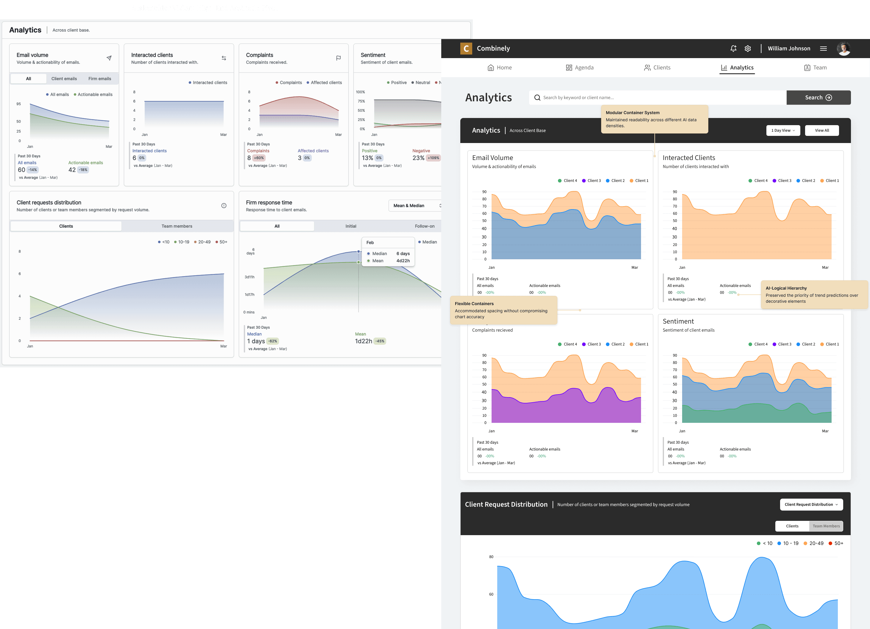 I reorganized the page to surface high-risk indicators first. Client complaints, sentiment drops, and workload spikes appear at the top of each visualization. This priority-based structure meant accountants could identify issues in seconds rather than scanning through all client data.