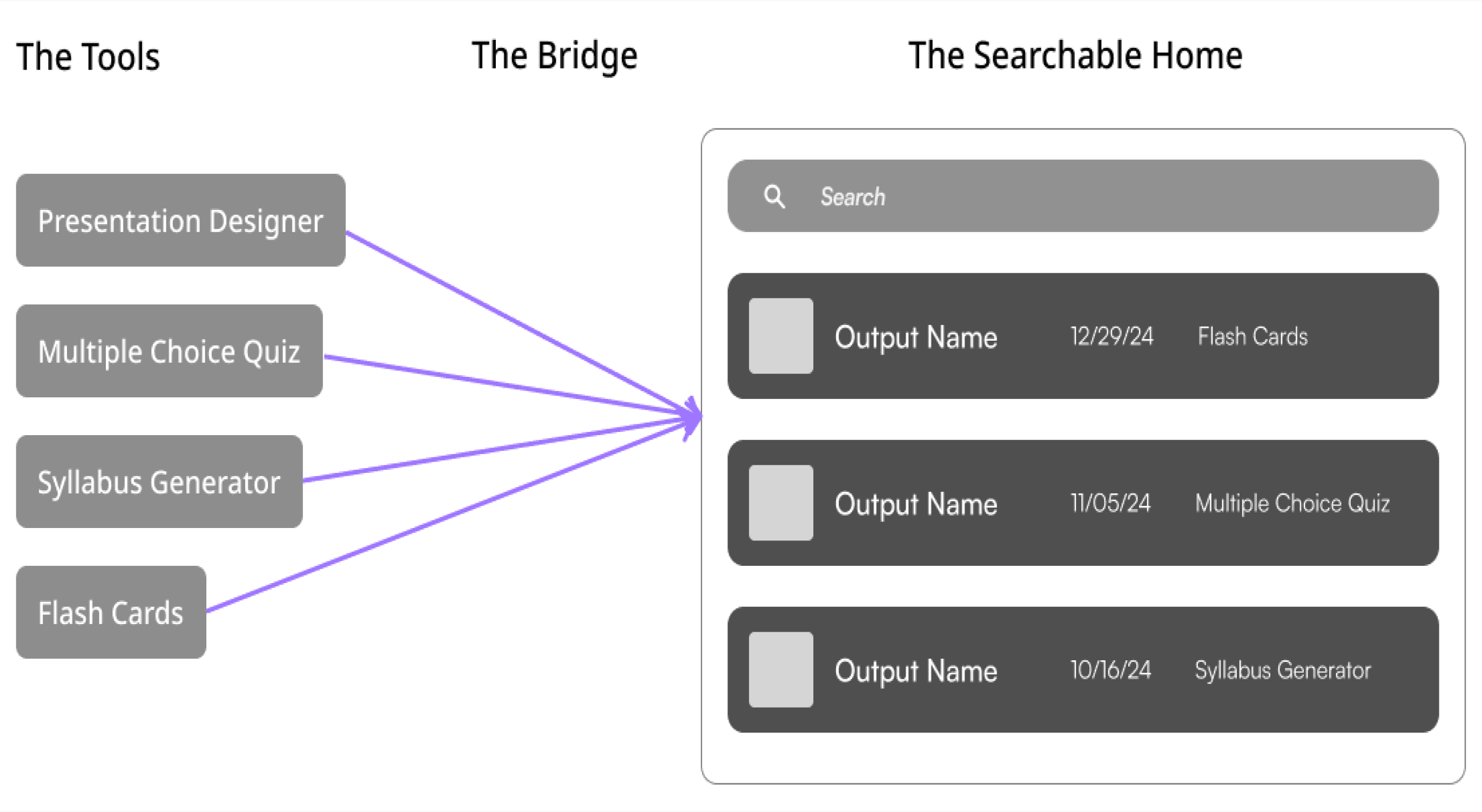 The platform had separate tools for creating presentations, but no unified way to access past work. Teachers couldn't find previous presentations because they were scattered across different creation sessions with no way to search, filter, or organize them. This fragmentation undermined the platform's value, as teachers spent more time searching than creating.