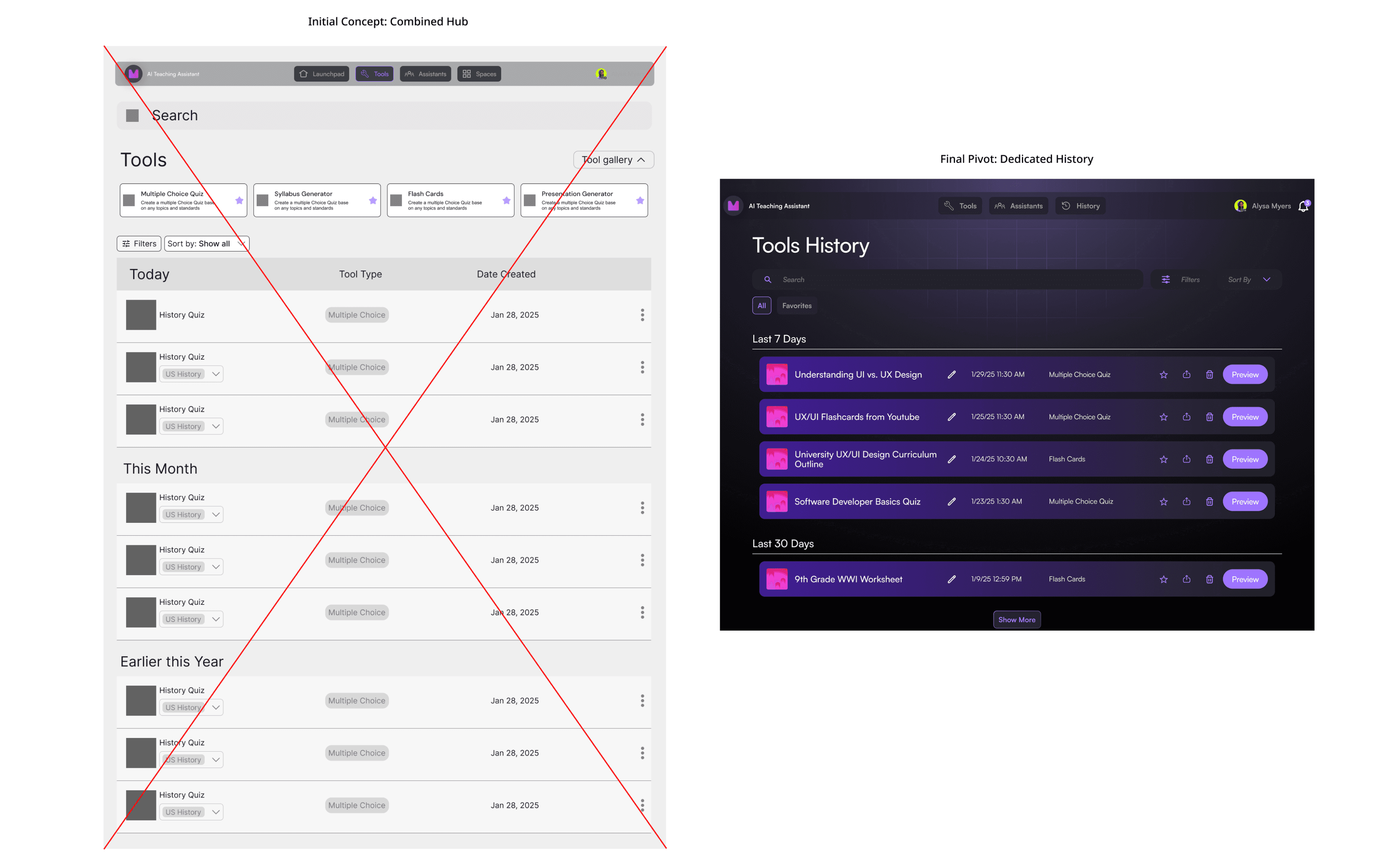 Mid-project, stakeholders decided against combining the creation tool and history view into one interface. This required pivoting to a dedicated history-only page, which meant the content library couldn't include inline editing capabilities.